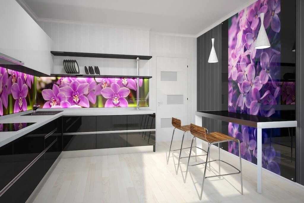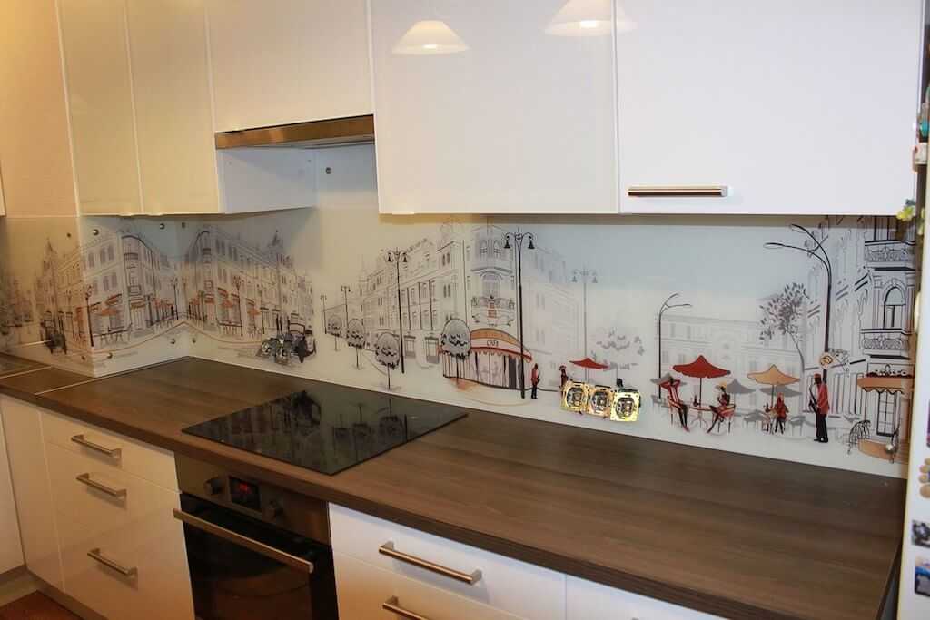 - высокая стоимость такого фартука связана с тем, что полотно чаще всего делается под заказ, исходя из индивидуальных особенностей помещения;