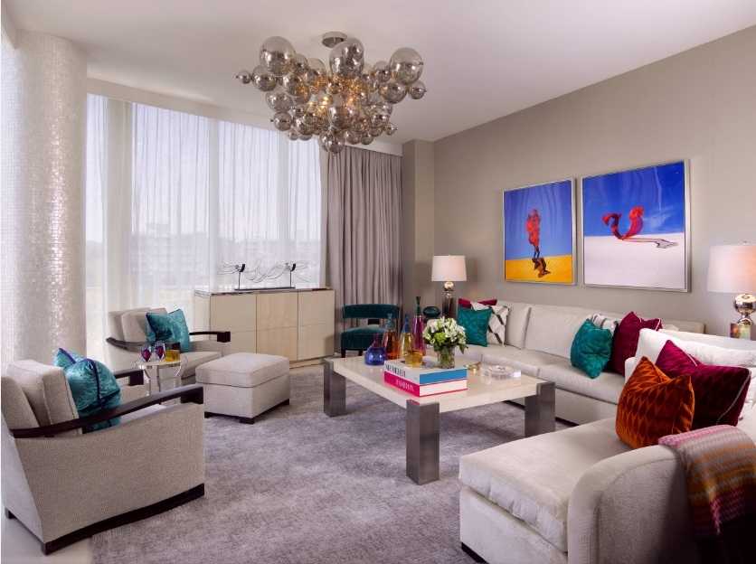 Насыщенные цветовые вкрапления позволят оживить классическую интерьерную картину и придать обстановке экспрессивности. Небольшое количество ярких акцентов наделит гостиную неповторимой колоритностью