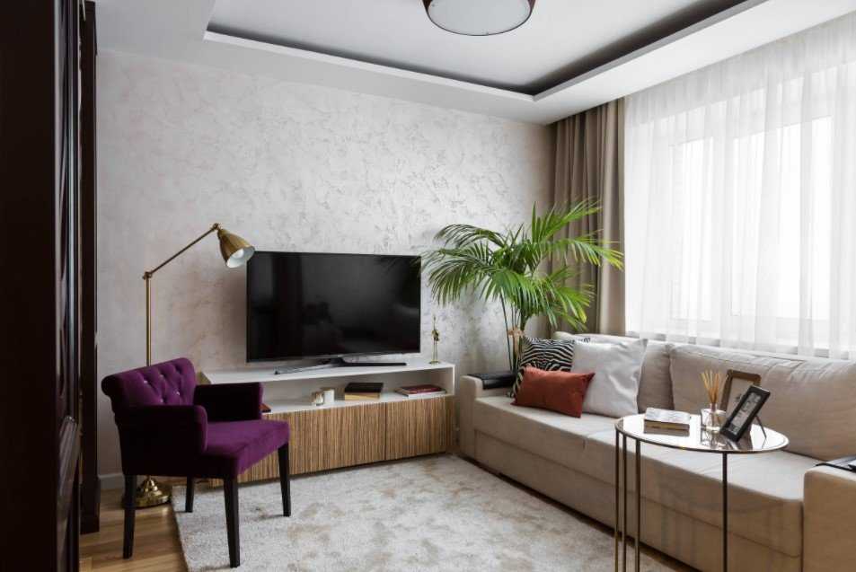 Используется для этого серый или бежевый цвет обоев, большой плазменный телевизор с черной поверхностью.