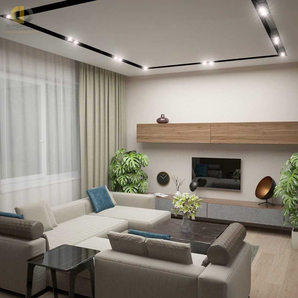 Что касается выбора мягкой части, то для такой гостиной актуально остановить выбор на небольшом диванчике и паре мобильных и практичных пуфов. Для поддержания целостности более габаритных квадратных гостиных, вы, наоборот, можете разделить помещение на зоны, используя, к примеру, массивный диван. В этом примере дизайнеры советуют заполнять пространство, разбивая предметы по группам.