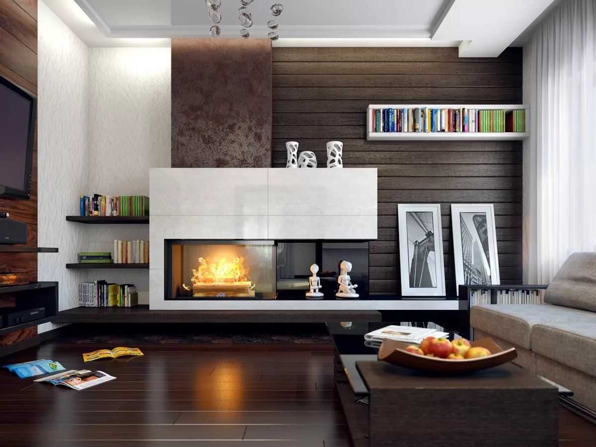 - крупное зеркало от камина до потолка зрительно расширяет кубатуру;