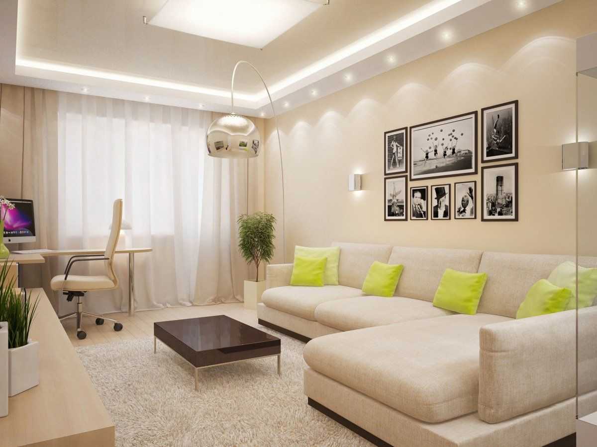 Правильному делению пространства на зоны способствует тщательный выбор планировки освещения. Удачно подобранные светильники придают атмосфере гостиной уют и комфорт. В рабочей зоне освещение делают достаточно ярким, а в зоне отдыха – более приглушенным. Правильный баланс можно обеспечить использованием точечных, галогенных и светодиодных световых приборов. Слоты и встроенные системы по периметру потолочного покрытия или стен придадут ощущение тепла и воздушности.