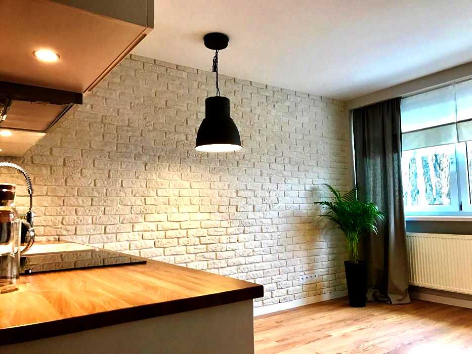 - Кухня подвержена загрязнению, но правильно закрепленный кирпич надолго сохранит эстетичный вид в этом помещении,