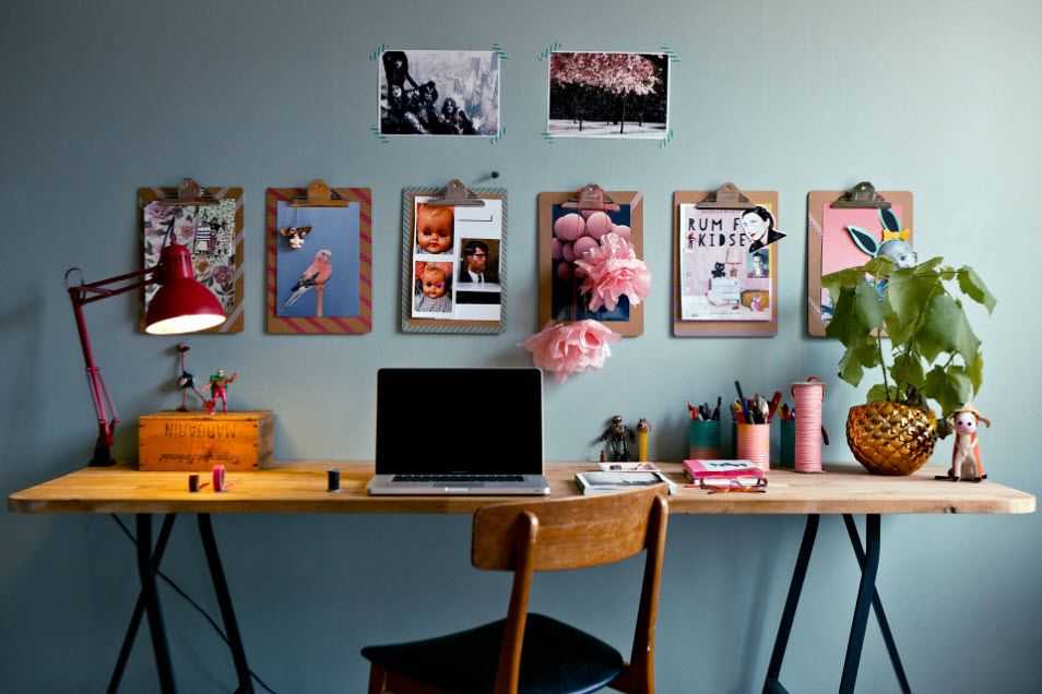 Неординарно смотрится панно из древесины над столом с мотивирующей надписью. Деревянная столешница отлично дополняет гармоничную композицию. Замечательная идея с ежедневником на стене. Каждый раз на бумаге можно записывать планы на день.