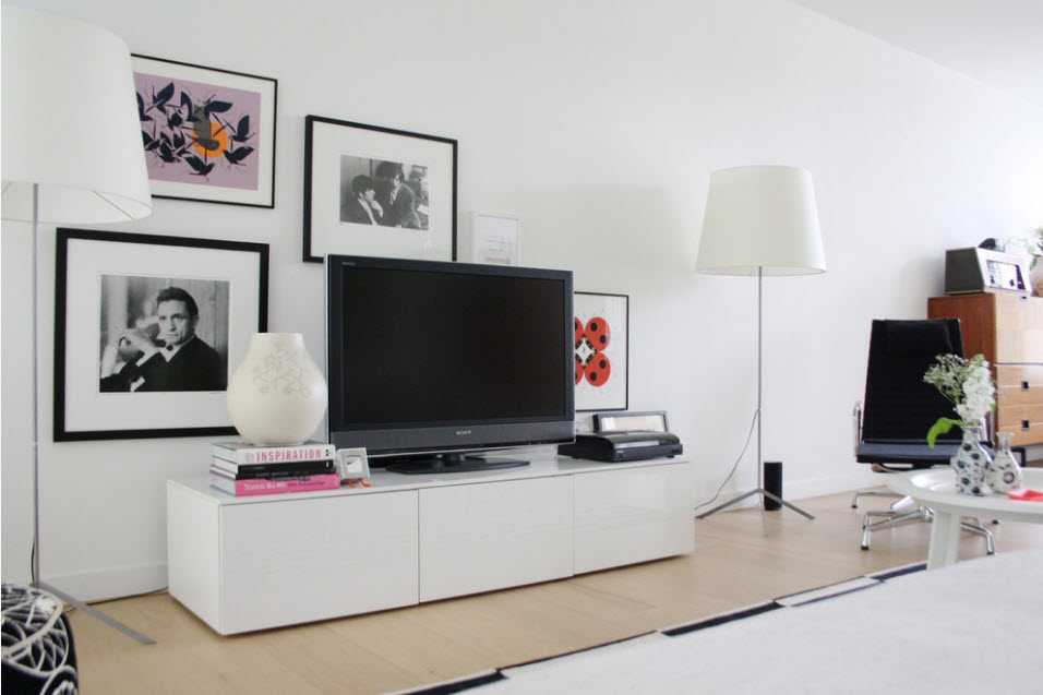 Еще оригинальные решения для гостиной. На одной стене располагаются функциональные ниши, а на другой большие фотографии в рамках.