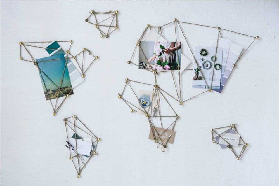 Совет: чтобы не ошибиться в складывании пазла, потренируйтесь на столе. Положите несколько полотен обоев изнаночной стороной и группируйте композицию с фото, пока не достигнете желаемого результата. Далее обведите рамки, перенесите схему на кальку и приложите к стене. Теперь у вас есть правильная схема размещения креплений для декора стены фотографиями.