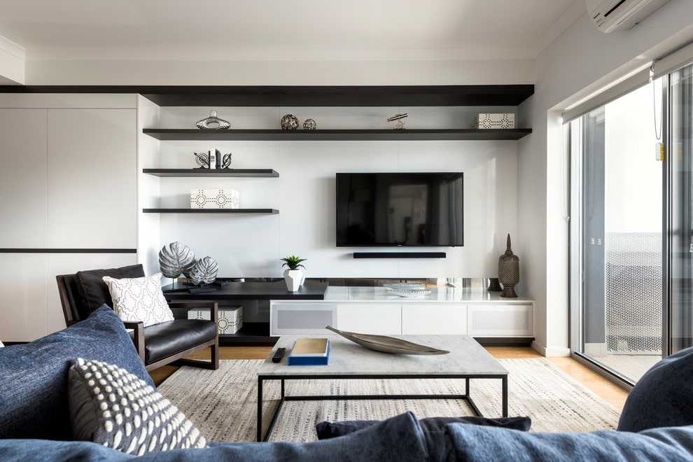 Асимметричная композиция подходит для стилей хай-тек, модерн и минимализм. Чаще всего используется в случае, когда нельзя выделить под ТВ целую стену или если рядом расположена дверь. Асимметрия хороша для зонированных или совмещённых помещений — кухни-гостиной, комнаты ребёнка.