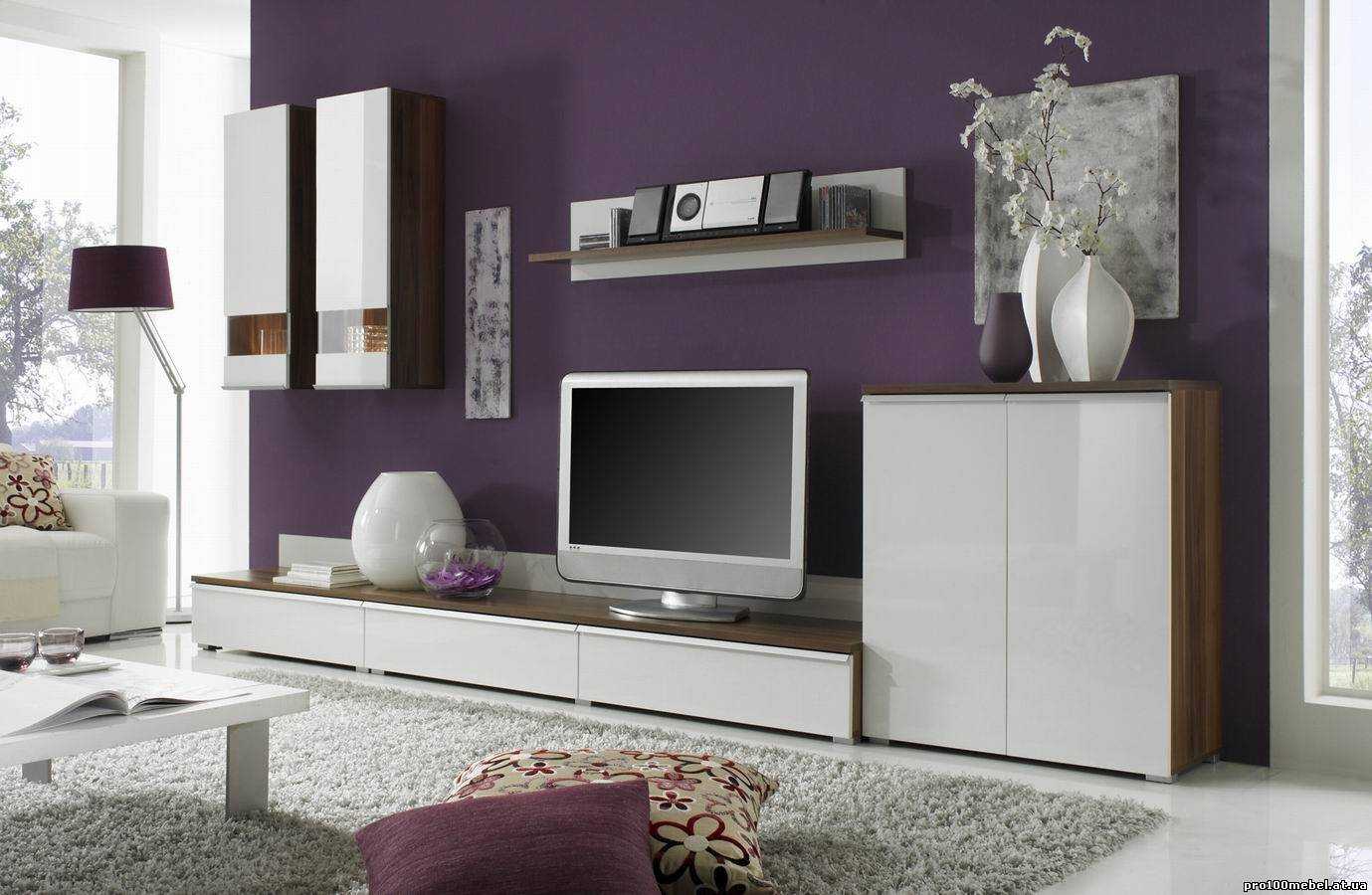 Если немного остановиться на цветовых сочетаниях интерьера, то белая стенка отлично будет сочетаться с бежевой, серой, темно-серой, синей, оливковой, кофейной отделкой стен. Если же вы поклонник экспрессивного интерьера, то попробуйте сочетать красные, оранжевые, бирюзовые или фиолетовые стены с белой мебелью. Она слегка смягчит яркие кричащие цвета.