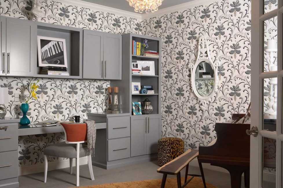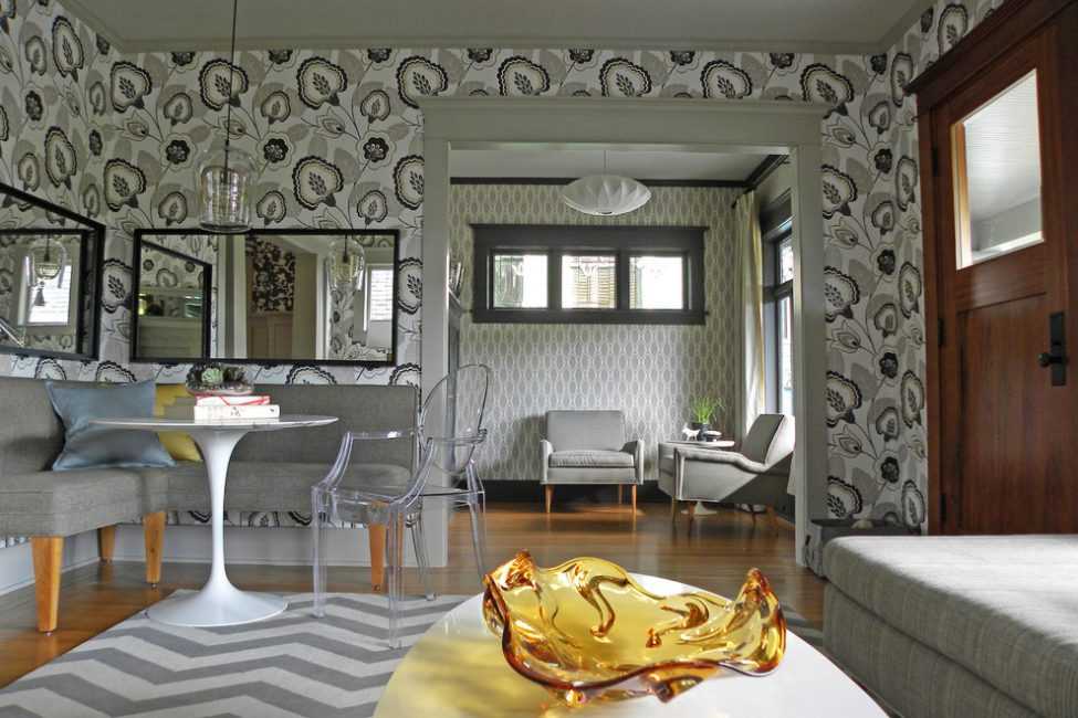 серый. Бело-серые обои в интерьере пользуются популярностью благодаря нейтральности и приглушенности. Такой дизайн способствует расслаблению и отдыху. Создать изысканный дизайн с помощью серых оттенков можно, используя бело-серебристые обои. К примеру, белые обои с серебристым рисунком в виде крупных орнаментов станут отличным вариантом для классического дизайна;
