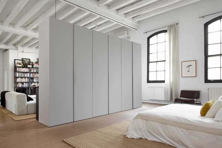 Важно! Используя в качестве перегородки шкафы или полки, убедитесь, что они надежно закреплены. Иначе конструкция может рухнуть даже от легкого прикосновения. Новое в дизайне совмещенных помещений – крутящийся шкаф