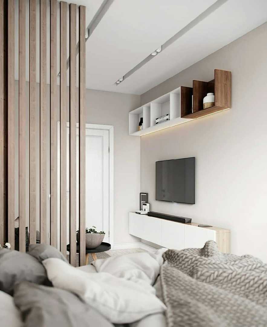 Все предметы интерьера можно поставить вдоль свободной стены, а напротив нее установить ТВ с тумбой или камином. Разделить детали, относящиеся к разным зонам, можно при помощи высоких перегородок до потолка или низких гипсокартонных стен-полок. Здесь важен правильный расчет квадратных метров, чтобы пространства вдоль стены хватило на всю мебель (диван, тумбы, кровать, письменный стол).