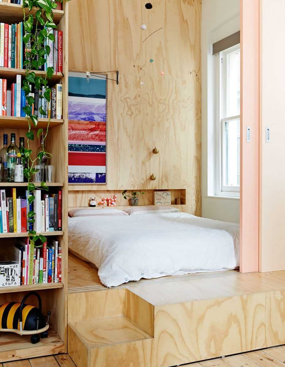 Небольшое возвышение в области установки кровати визуально делит помещение. Но это будет оптимальным решением при наличии свободного пространства в остальной зоне.