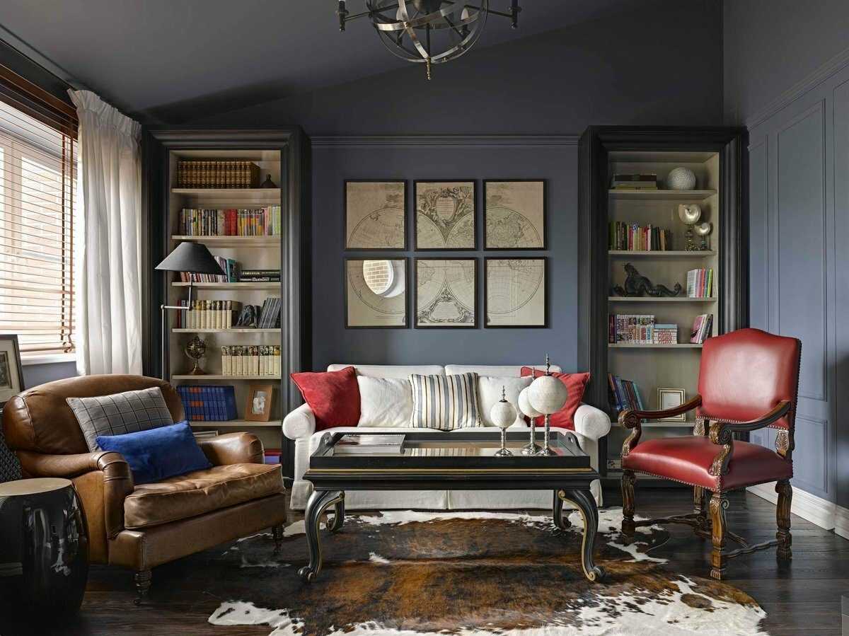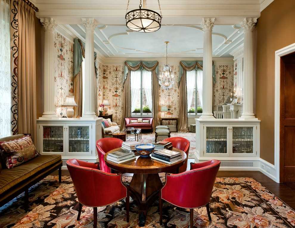 Поскольку мебели в комнате много, она может быть совершенно разной. Массивные шкафы и легкие этажерки, тумбы и стойки, на которых стоят светильники или предметы роскоши – практически все, что угодно. Только чтобы сочеталась с общим дизайном комнаты.