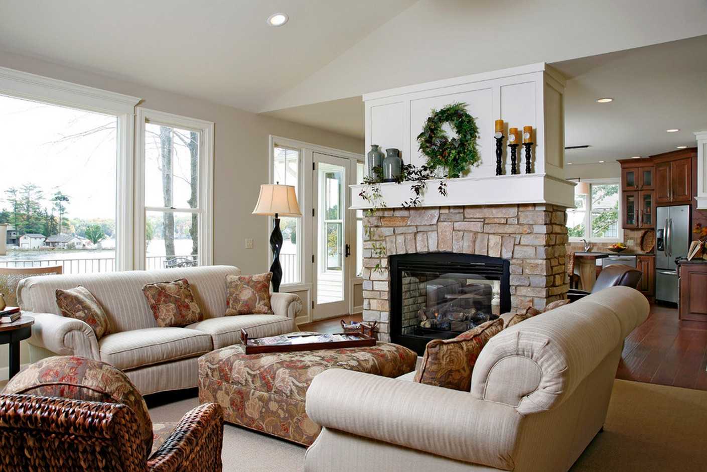 Для традиционной английской гостиной камин является обязательным атрибутом, а не только предметом декора. Присутствие огня в очаге – это уют, потому обстановка должна быть соответствующей: диван, несколько кресел, различные мягкие скамеечки и пуфы, изящные столики.