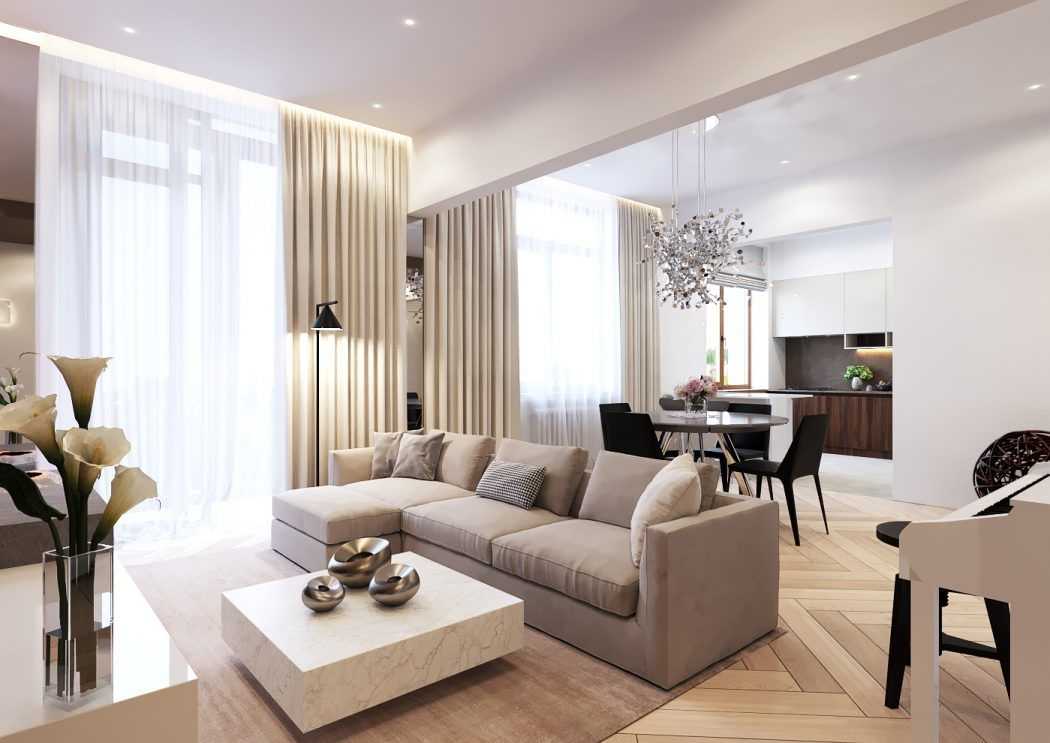 Гостиная в светлых тонах неразрывно связана с природой. Оттенки, используемые в помещении, обычно белые, бежевые и серые. Нейтральные цвета также включают расцветки меда, песка, экрю и цвета слоновой кости.
