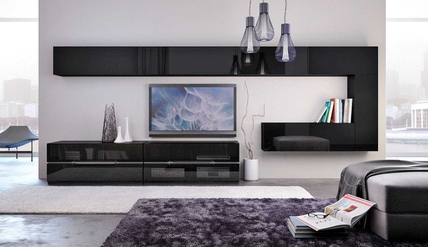 Белые глянцевые шкафы с черными боковинами отлично впишутся в интерьер стиля модерн или скандинавского. Для модерна также можно использовать черно-красное сочетание фасадов. Минимализм приветствует использование мебели такого типа. Обычно количество мебели для гостиной ограничивается длинной низкой тумбой под ТВ и одной или двумя подвесными системами хранения. Как правило, ручки отсутствуют, цветовое оформление при этом сдержанное.