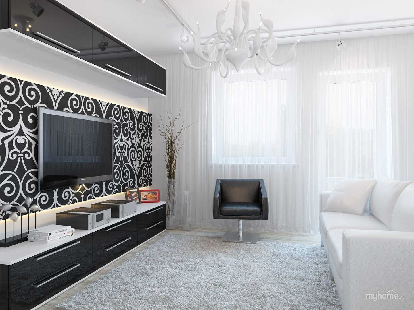 Черно-белая гостиная с большой люстройИсточник Ремонт без проблем