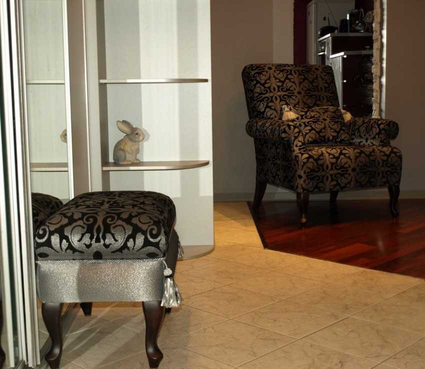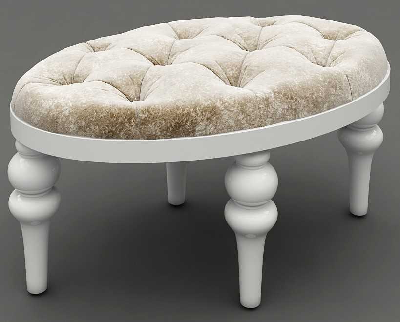 В классическом исполнении пуф будет иметь вид массивной деревянной конструкции с ножками. Для обивки используется кожа или ценная ткань. А вот для стиля барокко подойдет покрытие сиденья бархатом или замшей с богатым украшением каркаса.