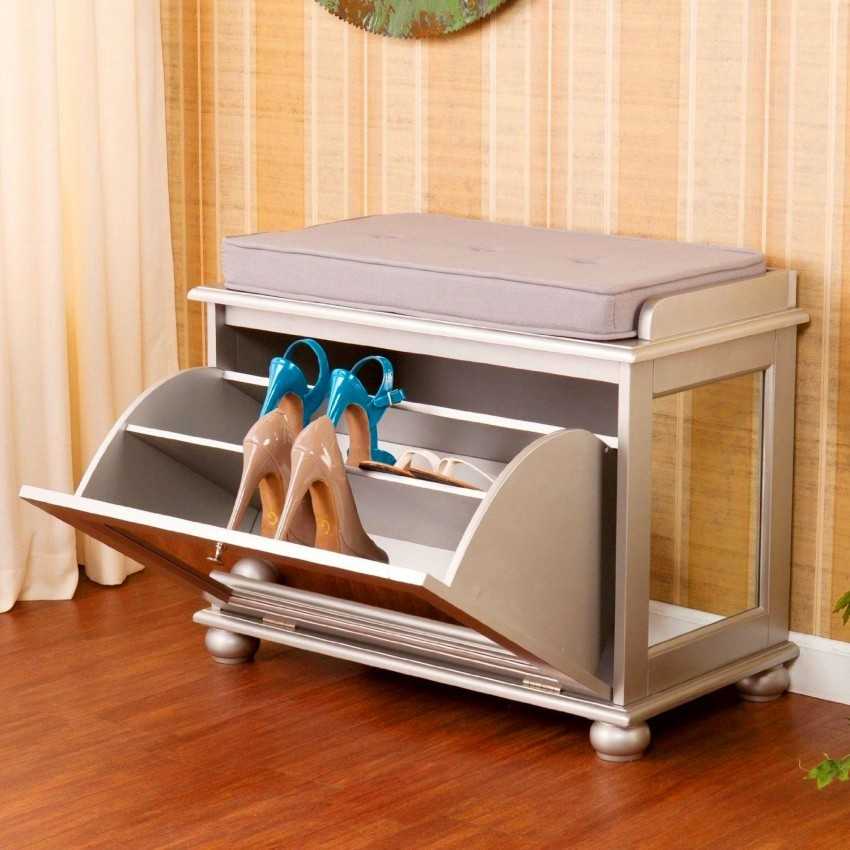Есть пуфики с выдвижными ящиками. Они более удобны в эксплуатации. Производители также предлагают решения с открытыми полками для обуви.