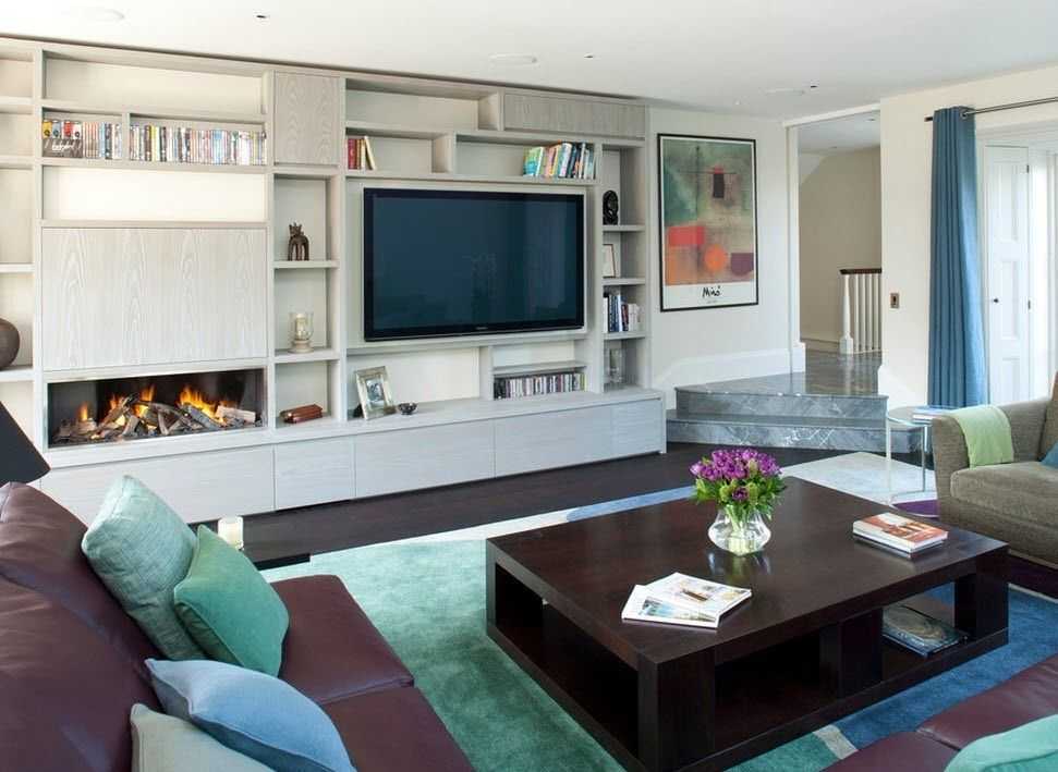 ТВ-экран, встроенный в мебель. Разработчики модульной мебели чаще всего предусматривают место под телевизор. Популярный вариант размещения – когда для монитора ТВ отводится центральное место, по середине прямоугольника, который образуется высокими боковыми шкафами, нижней тумбой и верхней полкой. Особенно благородно выглядит вариант с мебелью темных оттенков – тогда телевизор будто сливается с мебелью, за счет этого пространство становится более целостным, монолитным;