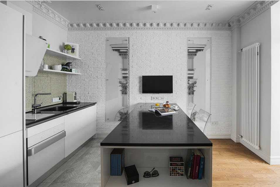 Также для гармоничного сочетания, современную технику оформляют с помощью багетных и деревянных рам под старину, молдингов, лепнины с патиной или размещают тв-панель на стене между колоннами или в нише.