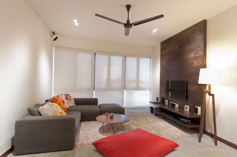 . Современный стиль легко распознать по характерным цветам. Он почти всегда представлен монохромными оттенками (черным, серым, белым) в сочетании с яркими акцентами. Если обойтись без них, то интерьер гостиной с телевизором станет безликим и скучным. Помимо цветовых акцентов, дизайнеры используют большие яркие постеры и картины, выдержанные в одном стиле. Декора не должно быть много. Как уже упоминалось, современному стилю характерен минимализм. Мебель должна соответствовать двум параметрам: удобство и простота.