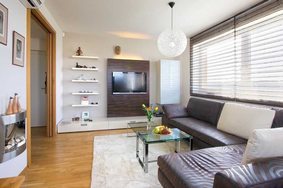 Современный стиль дизайна гостиной с телевизором универсален, сочетает в себе минимализм и многофункциональность. Он подходит как для просторных, так и для небольших помещений.