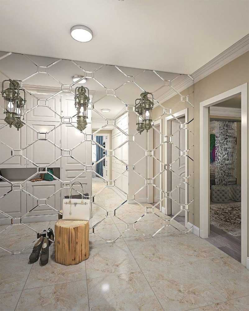 Декоративные зеркальные плитки — отличный способ поднять стандарт узкого коридора. Благодаря изображениям, воспроизведенным в зеркале, интерьер приобретет глубину, покажется шире и просторнее. Если зеркальная плитка в зале будет достаточно большой, и, кроме того, она будет выполнена из стандартного (серебряного) стекла, она успешно заменит обычное зеркало.