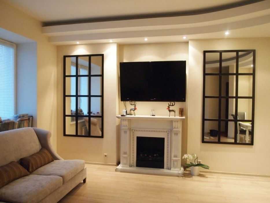 Простые настенные композиции из зеркал в гостиной выглядят как дополнительные окна (фальш-окна), что придает помещению глубины и света.