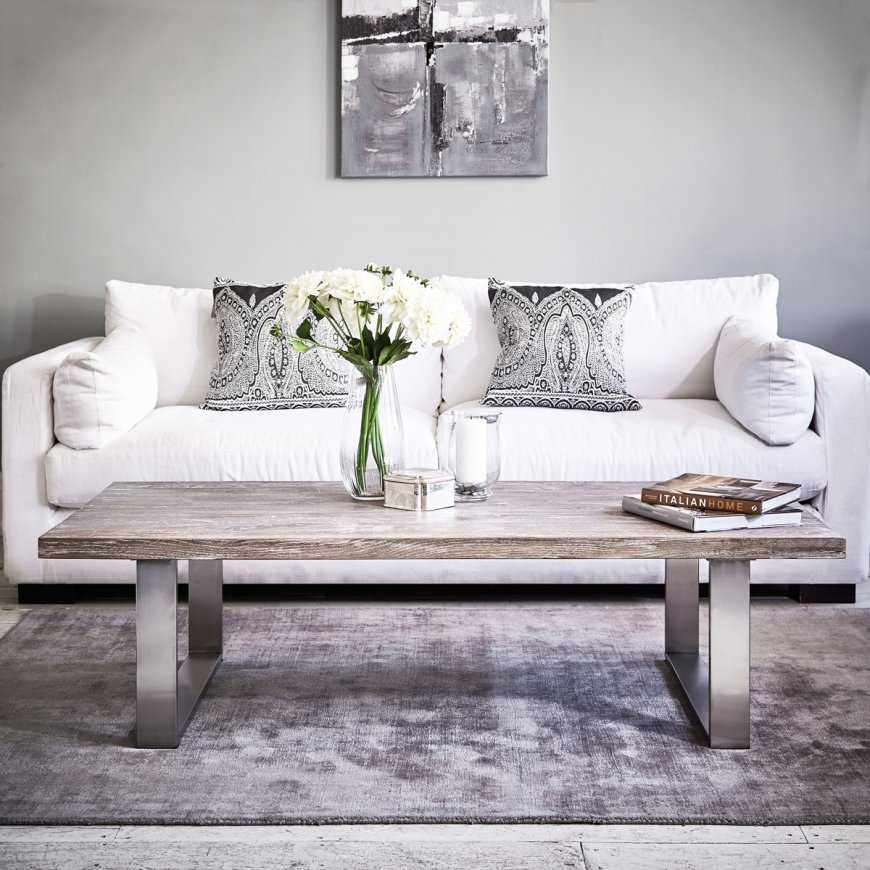 Журнальный столик из массива дерева в интерьере современной гостиной