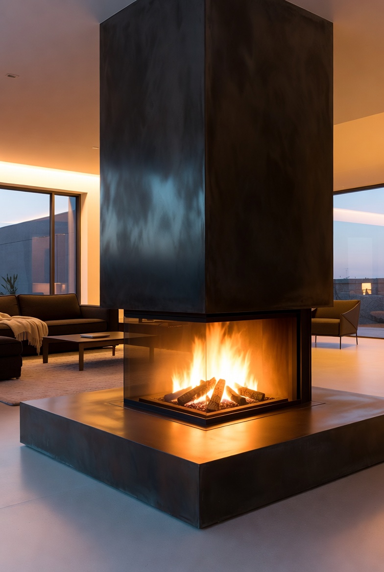 Топки трёхсторонние — это максимальное присутствие огня в пространстве. Не декоративный акцент. Не окошко в стене. Огонь как полноправный элемент интерьера, который виден отовсюду.